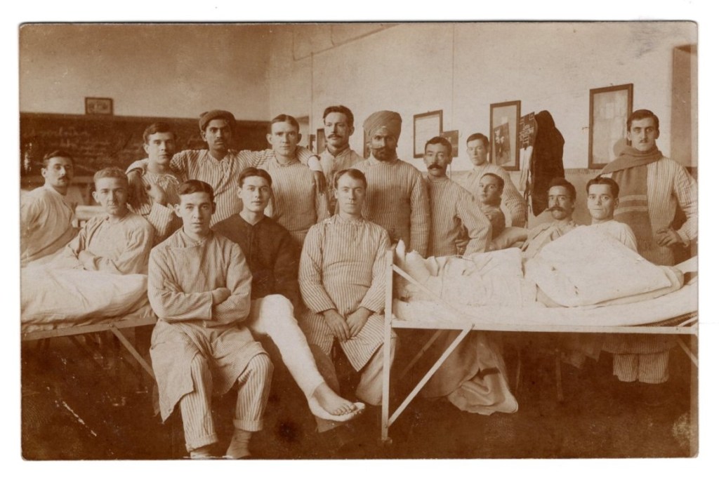 Gus is recorded in a photo alongside 15 other soldiers at a military hospital in Cologne. Two of the group are Indian soldiers. This is noteworthy given the recent debates about the use of non-white troops from the British Empire in the Great War and how their contribution was, for many years, either ignored or erased.