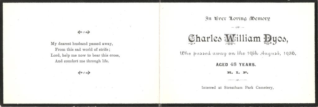 Back in civilian life, Charles became a nurse and spent time working at Holloway Sanatorium in Virginia Water, at the Manor House in Yateley, and at Southgate where he was employed by Sir Thomas Lipton, the tea merchant, philanthropist, and yachtsman. Charles married Alice Isabel Hayes, known as Isabel, in 1925 and gained a stepdaughter Marie. Charles and Isabel had a son together, Charles Graham Hayes Dyos, who was only five when he died in 1932. Charles himself passed away four years later in 1936 at the age of 48 and was interred in Streatham Park Cemetery.