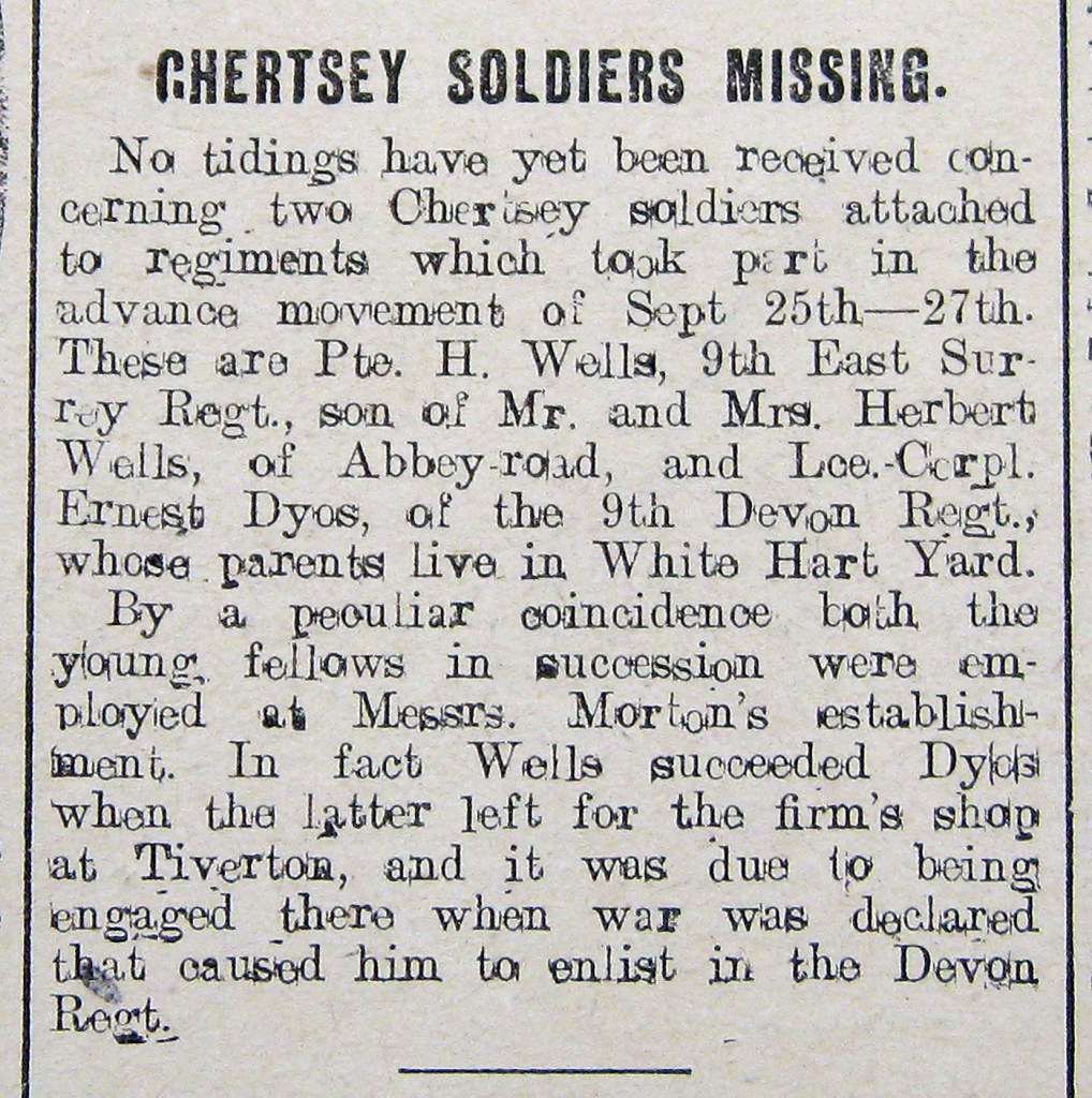 The Surrey Herald reported on 22 October 1915 that two Chertsey soldiers were missing, Lance Corporal Ernest Dyos of the Devonshire Regiment and Private Herbert Wells of the East Surrey Regiment. In a remarkable coincidence, Herbert Wells replaced Ernest Dyos at Morton’s boot shop when Ernest moved to Tiverton.