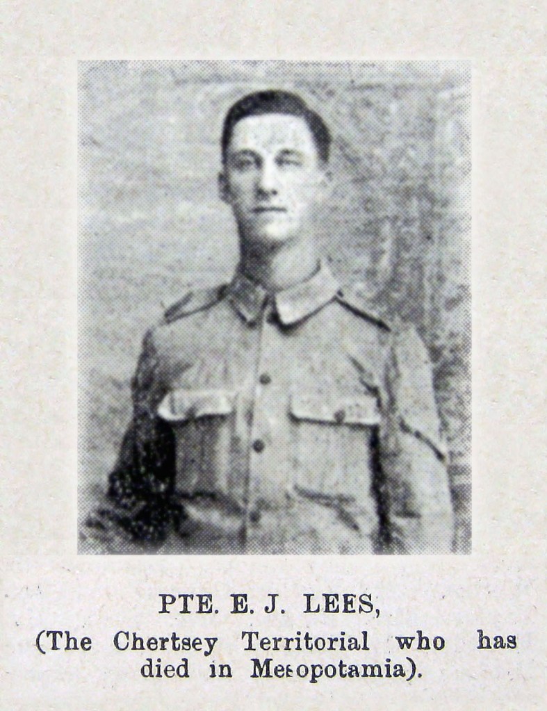 Private Edward James Lees is one of 3,704 service personnel buried at the Amara War Cemetery in what is now Iraq. He is named on the Chertsey Town War Memorial unveiled in Windsor Street in 1921 and in the Memorial Chapel in St Peter’s Church opened in 1922. In the chapel, there is also a window dedicated to Edward Lees. Frank Lloyd Parton is buried in the Parish of Egham.