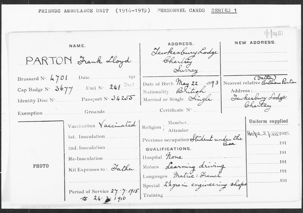 As Edward Lees headed for Mesopotamia in July 1915, Frank Parton was joining the Friends Ambulance Unit, a civilian volunteer ambulance service established by a group of Quakers the year before. He stated that he had two and a half years’ experience working in engineering shops. He had also qualified as a barrister but had not been called to the Bar. Frank served with the unit in France until February 1916 when he left because he thought the work was more military than civil. He also refused an employment offer from his father at Herring & Son because the firm was involved with munitions work.