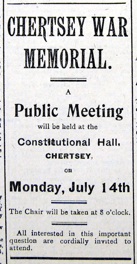 This blog has drawn on the many articles published in the Surrey Herald between 1919 and 1921 about the development of what became the Chertsey Town War Memorial. Thank you to Jim Knight who photographed these clippings for the Runnymede Remembered Archive, and to Emma Warren, Curator at Chertsey Museum for collating them.