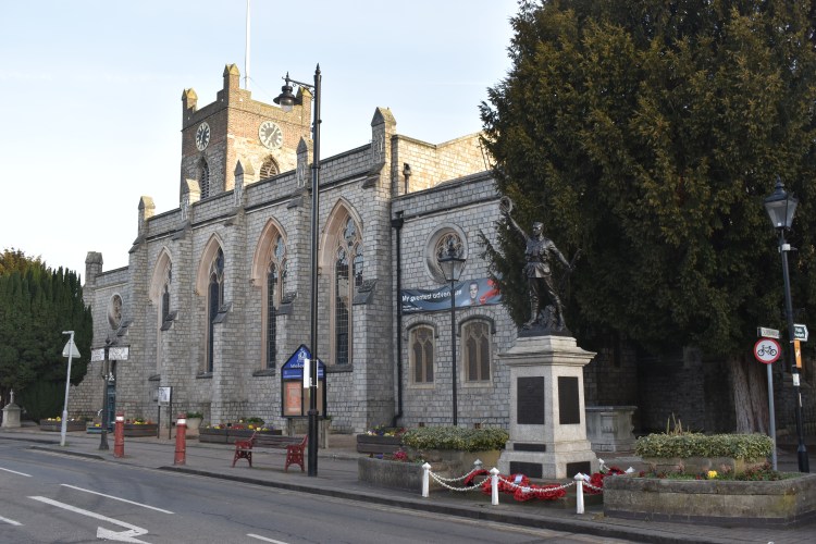 The memorial is located next to St Peter’s Church at the junction with London Street and Guildford Street.